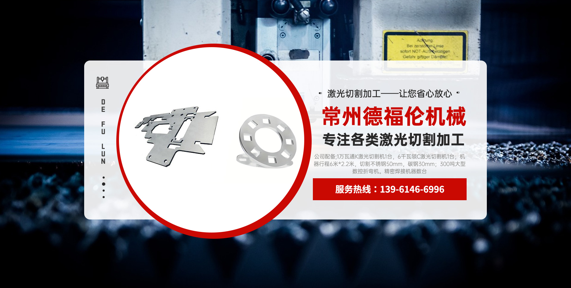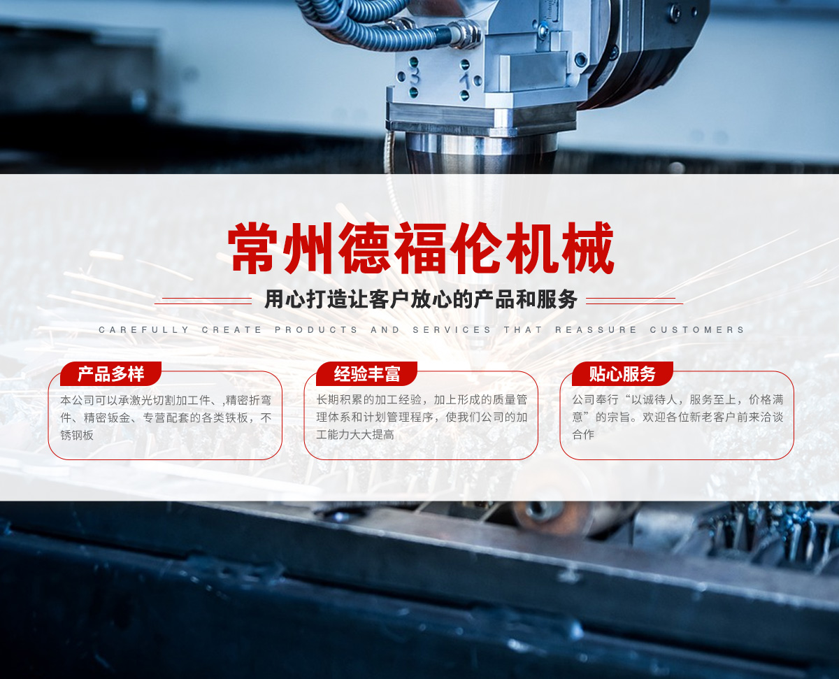 常州德福倫機械有限公司成立于2014年12月19號,位于江蘇省常州市武進區(qū)遙觀鎮(zhèn)建農(nóng)村劍童路56號西門;公司配備;1萬瓦通K激光切割機1臺,6千瓦領(lǐng)C激光切割機1臺;機器行程6米*2.2米,切割不銹鋼50mm,碳鋼30mm;300噸大型數(shù)控折彎機。精密焊接機器數(shù)臺。本公司可以承激光切割加工件、,精密折彎件、精密鈑金、專營配套的各類鐵板,不銹鋼板。長期積累的加工經(jīng)驗,加上形成的質(zhì)量管理體系和計劃管理程序,使我們公司的加工能力大大提高,滿足客戶所需,是我們公司的目標!公司奉行“以誠待人,服務為上,價格滿意”的宗旨。歡迎各位領(lǐng)導;老總前來洽談合作!